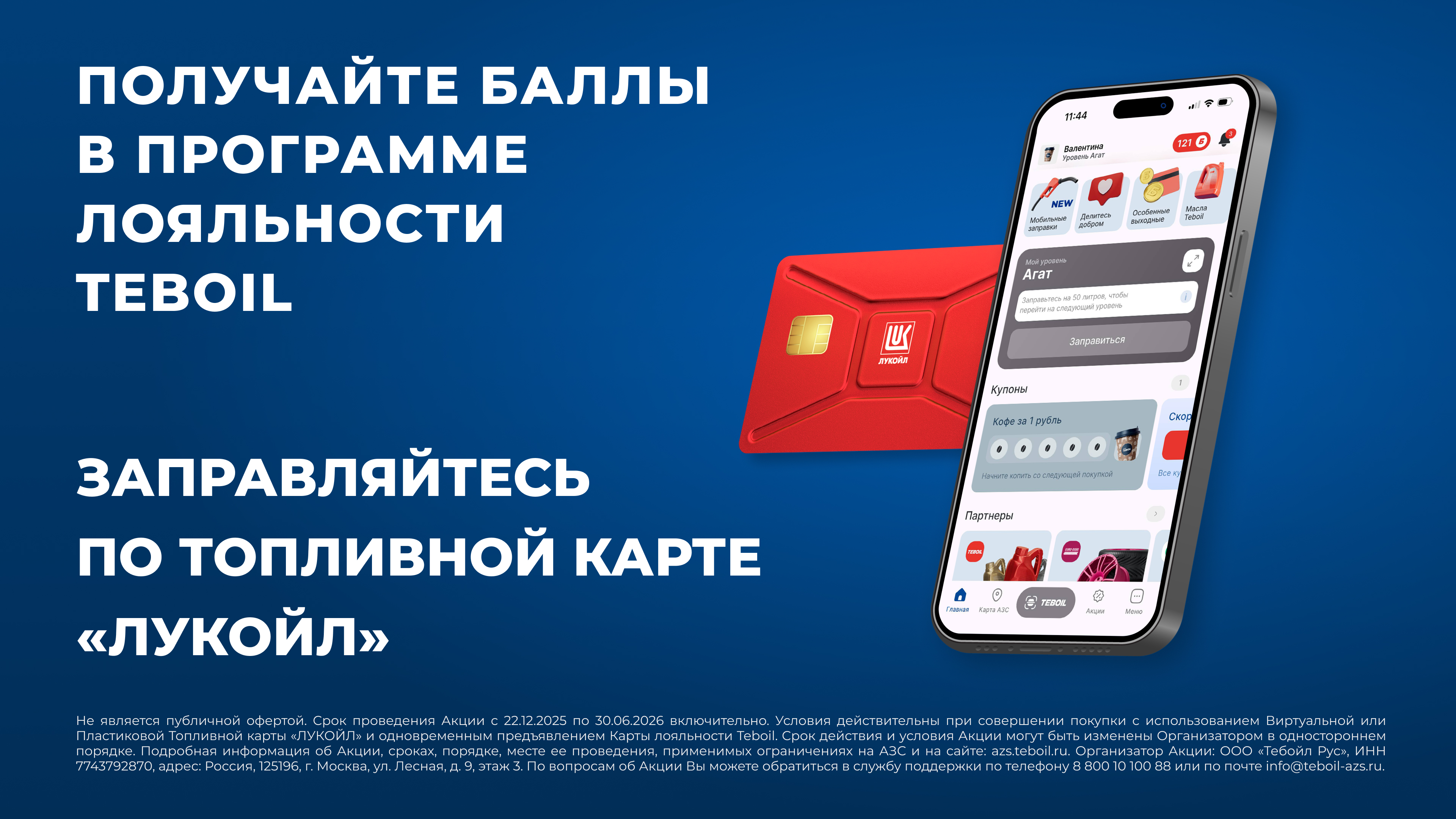 Акция для участников программы лояльности ЛУКОЙЛ «Заправься выгодой». Скидка действительна только при предъявлении QR-кода виртуальной карты из мобильного приложения «АЗС ЛУКОЙЛ». Одновременное применение карт лояльности Teboil и «Заправься выгодой» не допускается. Баллы за совершение покупок на АЗС Тeboil не предоставляются.